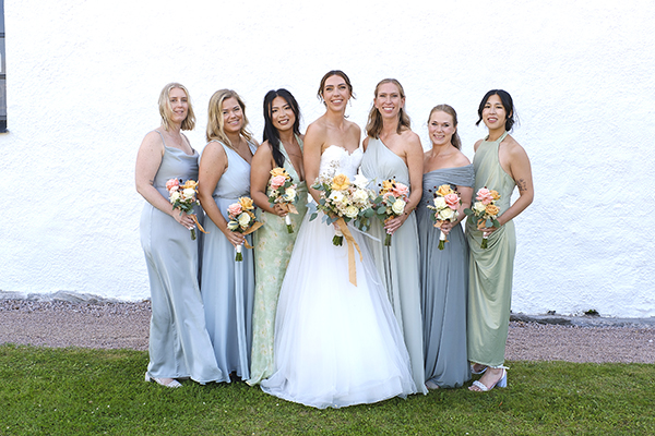 Förutom de hemodlade blommorna så fanns det även rosor, lisianthus och bäreukalyptus i Christines brudbukett. Flera av blommorna återfanns även i övriga blomsterdekorationer. När det gäller blomsterdekorationer så är det viktigt för Helene att alla blommor har ett syfte under hela dagen.