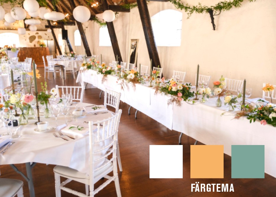 Färgerna fick gå i vitt, grönt och aprikos. De färgerna gick som en tråd genom allt från blomsterutsmyckning till dekorationer och dukning. Helene fick förtroendet att sköta helheten med dekorationer i såväl rummet som på bordet.