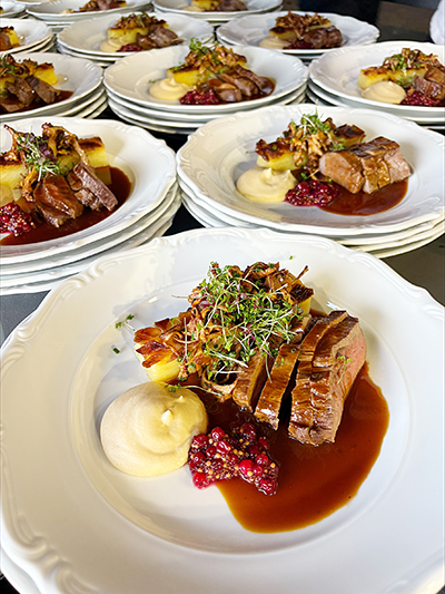 – Eftersom det var sensommar så fanns det till exempel gröna tomater som vi picklade till förrätten samt svamp och lingon som vi använde till varmrätten. Vi värnar lokala producenter och det var även viktigt för brudparet så hjortköttet köptes in från Hanaskogs gård, säger Martin.