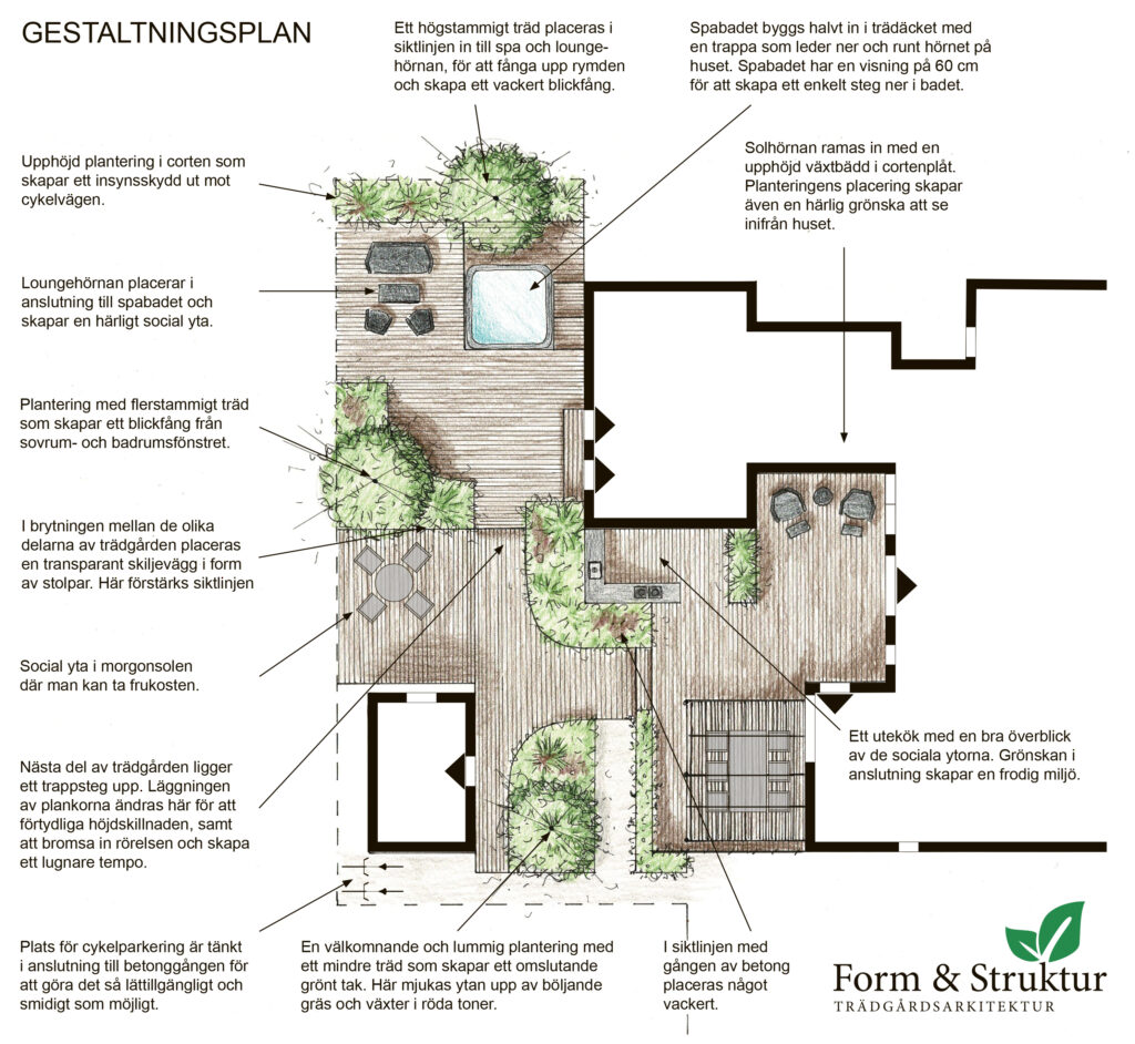 Trädäck är praktiskt och stilrent, men kan lätt bli tråkigt och kalt. Det gäller att planera för att göra det till ett användbart och mysigt ställe i trädgården. Form & Struktur Trädgårdsarkitektur får en hel del uppdrag där de ritar och planerar trädäck såväl vid nybyggnation som vid renovering.