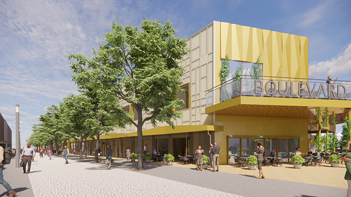 Den del av Boulevard som ligger söder om entrén vid Cardellsgatan kommer att försvinna. Även om man bjuder in till ”rivstart” är det faktiskt bara en mindre del som kommer att rivas – för att göra plats för det nya stråk som öppnas upp ner till kanalen. Resterande del, där högskolan ska ligga, demonteras istället och 10 000 kvadratmeter betong ska återbrukas – ett av Sveriges största återbruksprojekt någonsin.