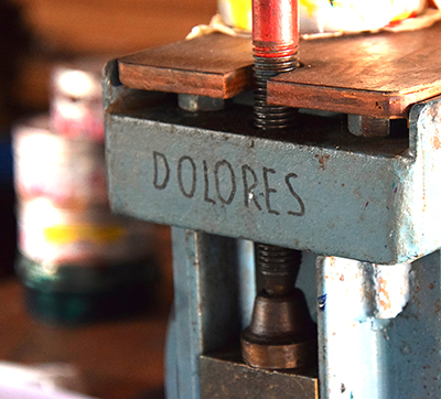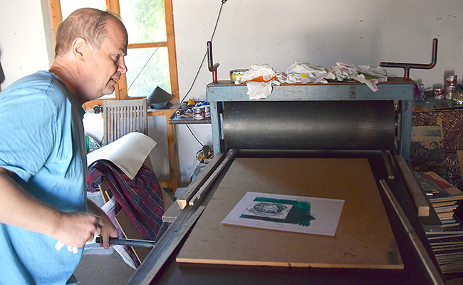 Och tryckningen gör han alltså i garaget där pressen står. Han berättar att det är den kände Åhuskonstnären Sven Bunnel som ägde den tidigare. Fredrik köpte den av Bunnels dotter,