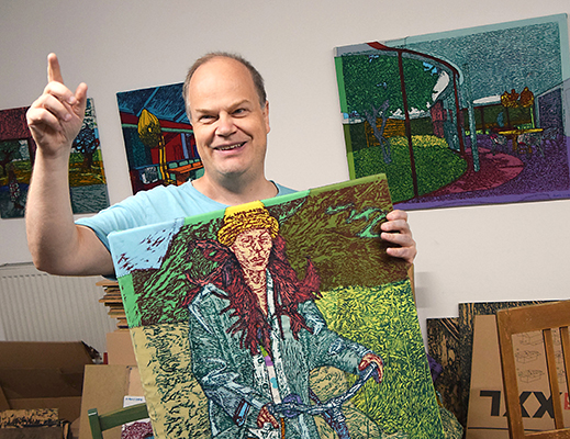 Fredrik Lindqvists konst kräver mycket arbete. Han erkänner också att han tycker att det är så roligt att han håller på timmar i sträck, ofta i skräddarställning på golvet i sin ateljé.