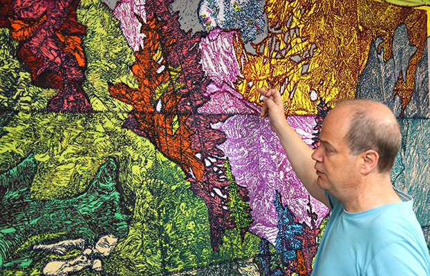 Fredrik Lindqvists konst kräver mycket arbete. Han erkänner också att han tycker att det är så roligt att han håller på timmar i sträck, ofta i skräddarställning på golvet i sin ateljé.